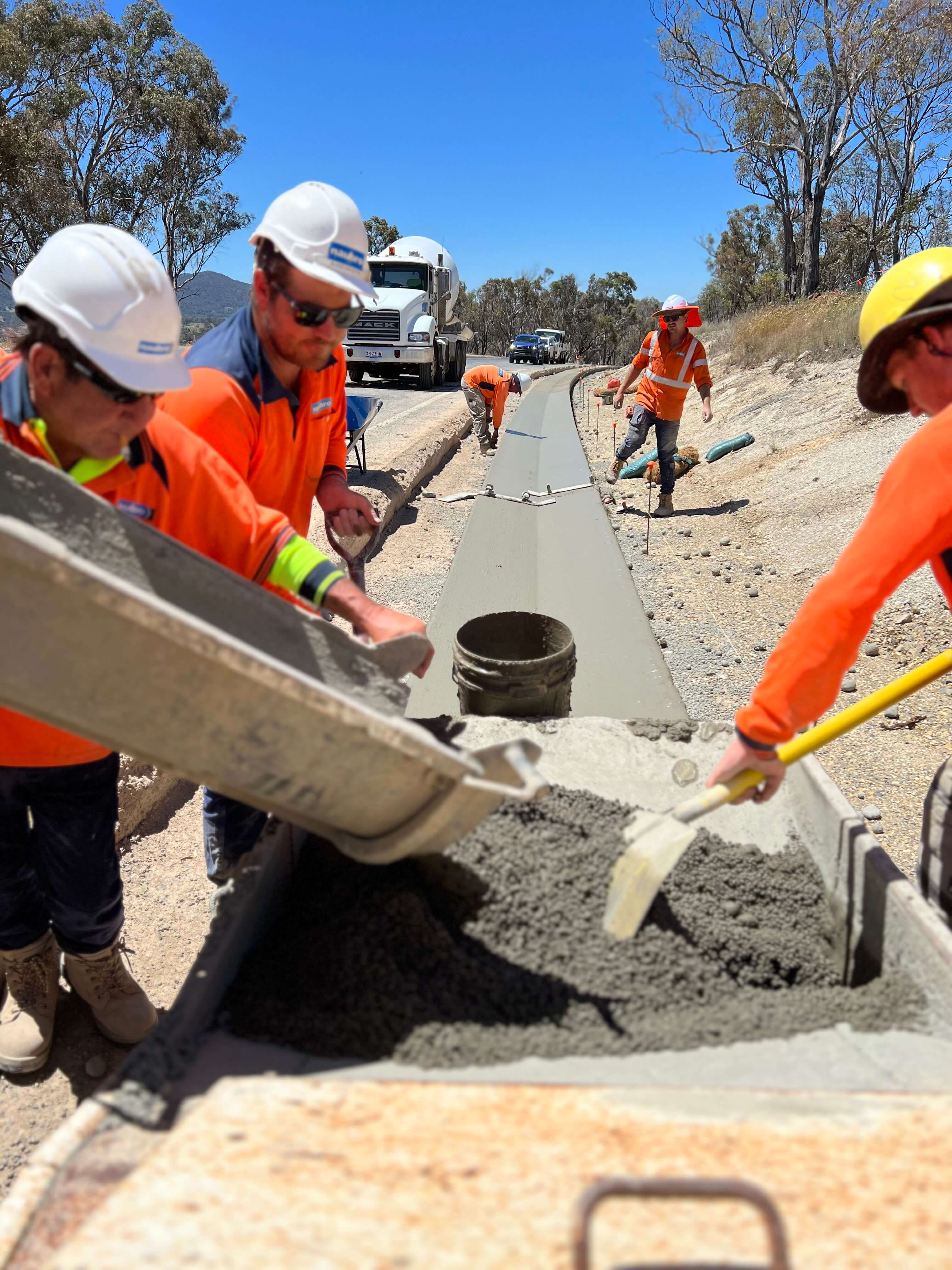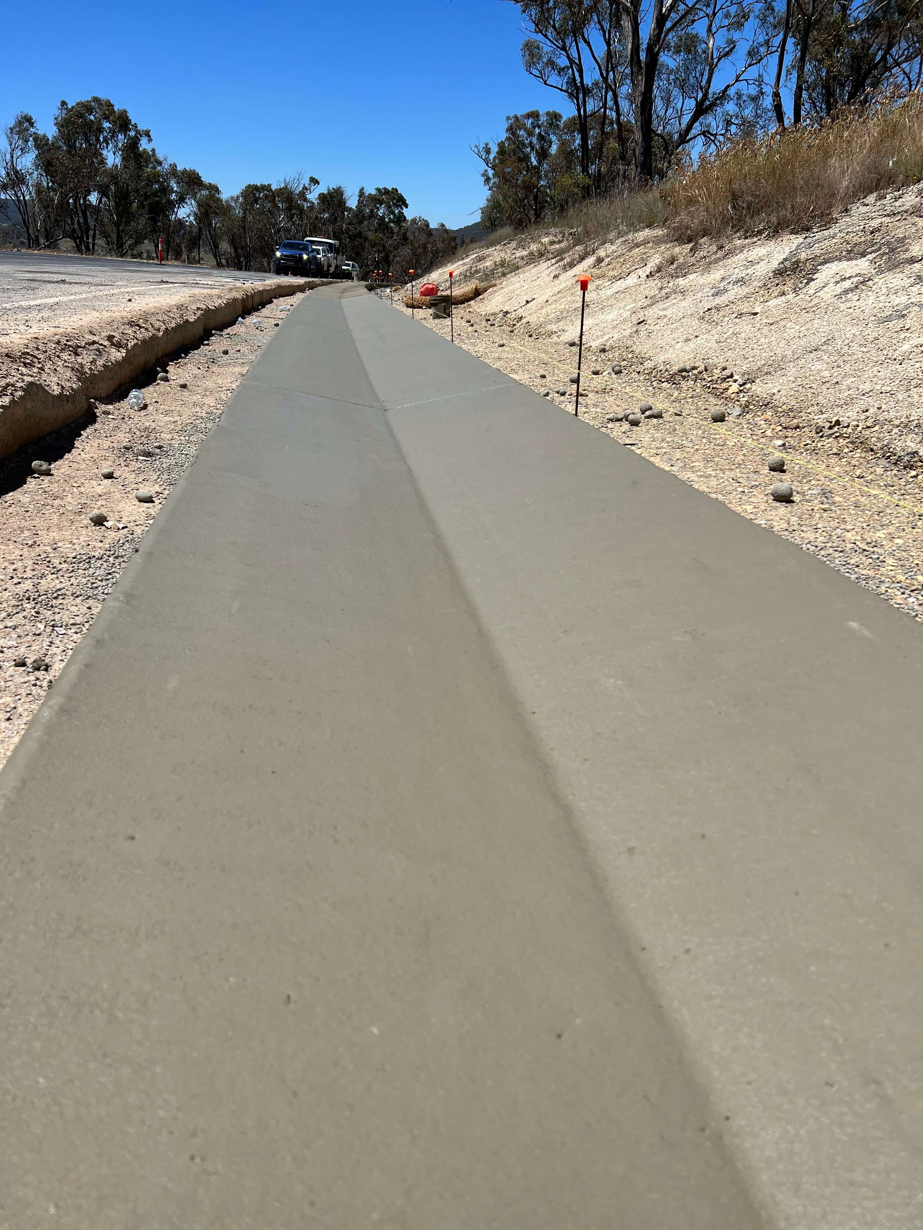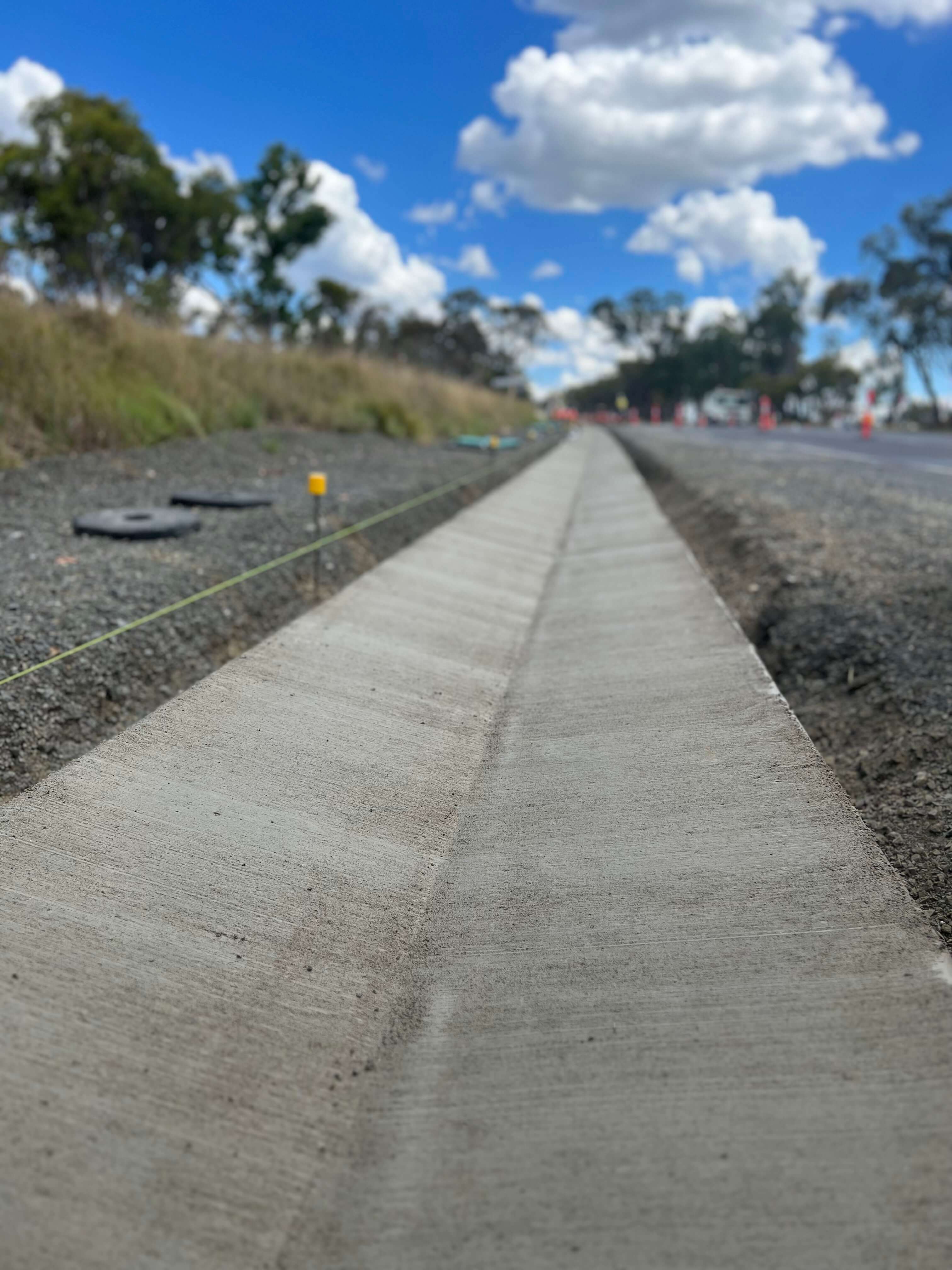 As part of the Gunnalong Safety Works Project on the New England Highway, approximately 6 km north of Bendemeer, the works involved the extrusion of kerb and gutter infrastructure in line with TfNSW requirements. The scope included 1,447 metres of S/O Kerb (Dish Drain) extrusion, placement of 1,447 metres of no-fines concrete bedding as a provisional item, and the construction of all required transitions and turnouts in accordance with project specifications.