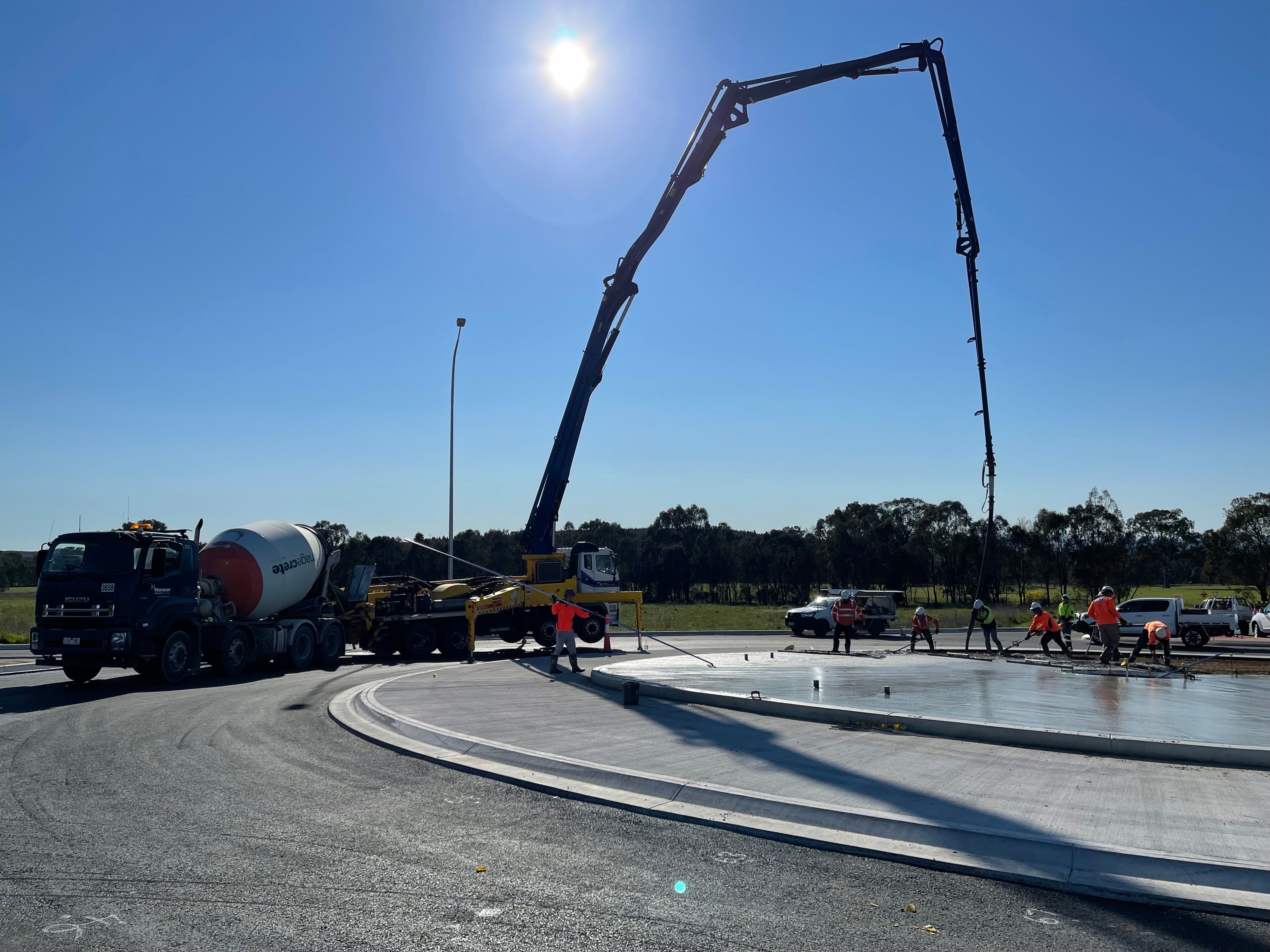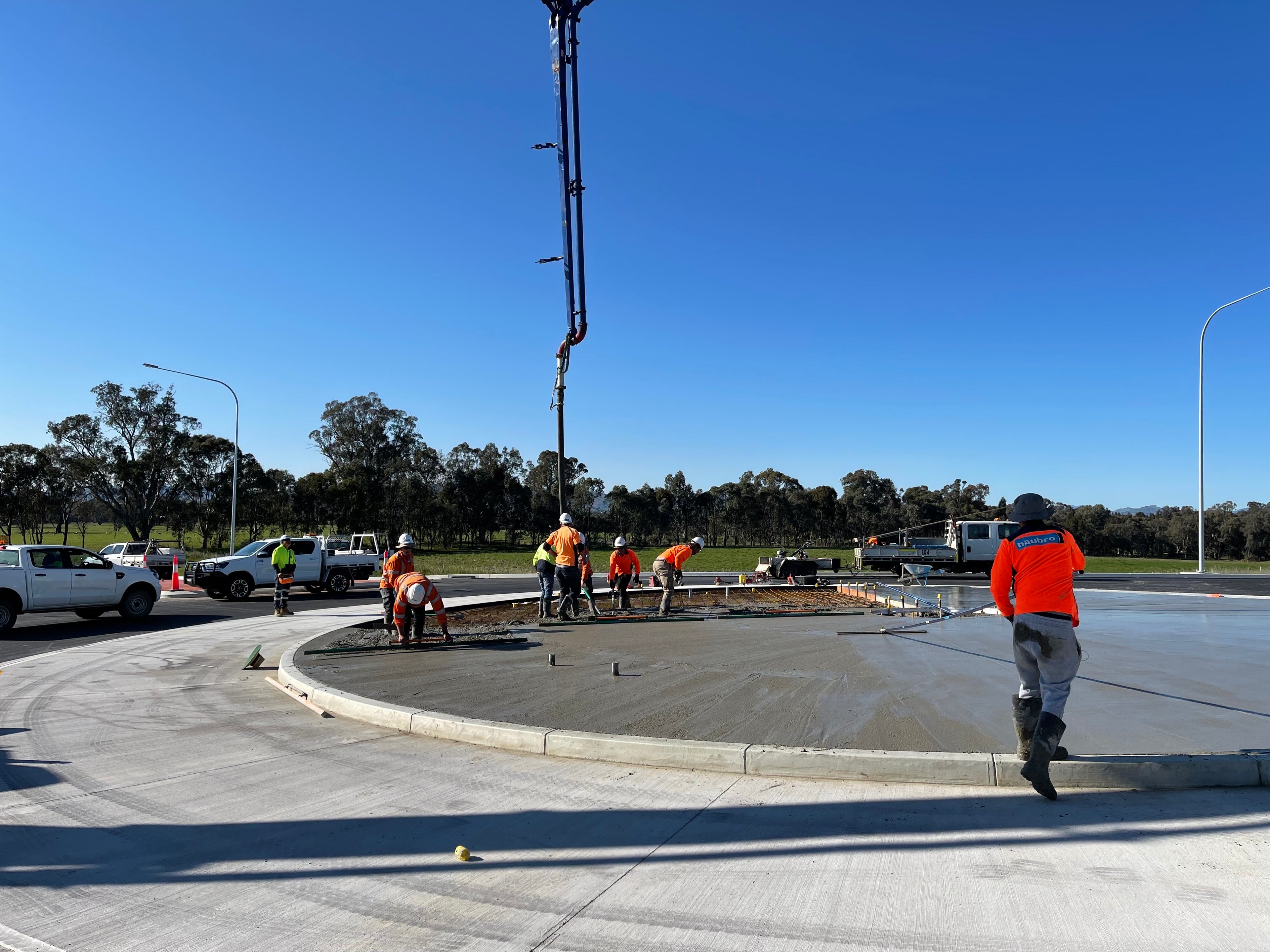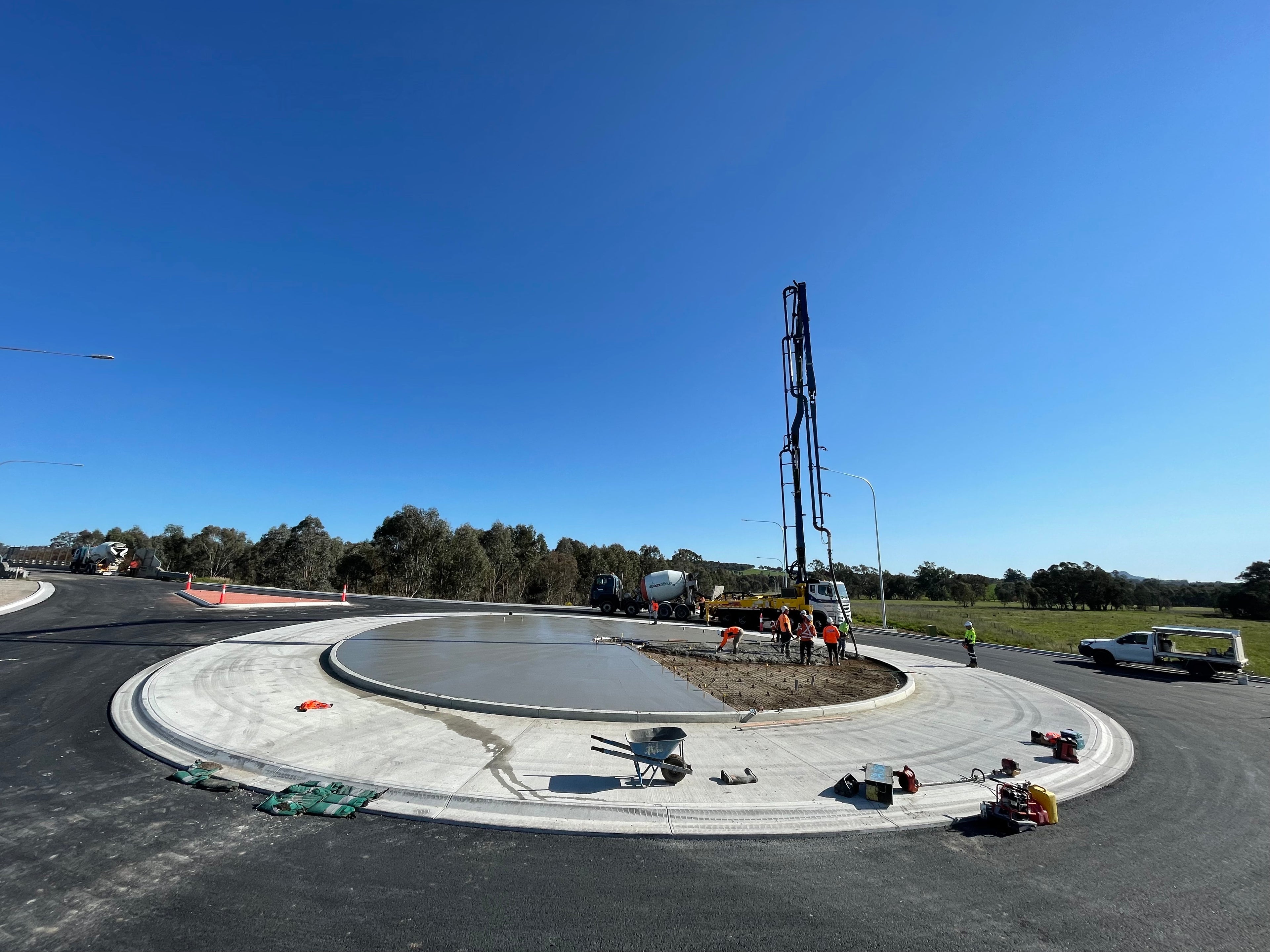 Works were delivered through staged sequencing to optimise construction efficiency while minimising traffic impacts. Activities involved excavation and preparation of no-fines pads with geotextile fabric, slipform extrusion of kerbs, and reinforced concrete pavement construction in accordance with the approved jointing plan. Central island infills were completed following kerb installation, with reinforcement, placement, and curing carried out to manufacturer and TfNSW specifications. All works were completed to TfNSW standards, ensuring long-term durability, safety, and performance of the interchange infrastructure.